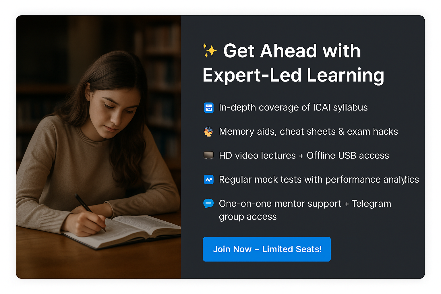 Our teaching is concept-driven, aligned with ICAI’s latest syllabus. We use real-world examples, MCQs, case studies, and exam strategies.